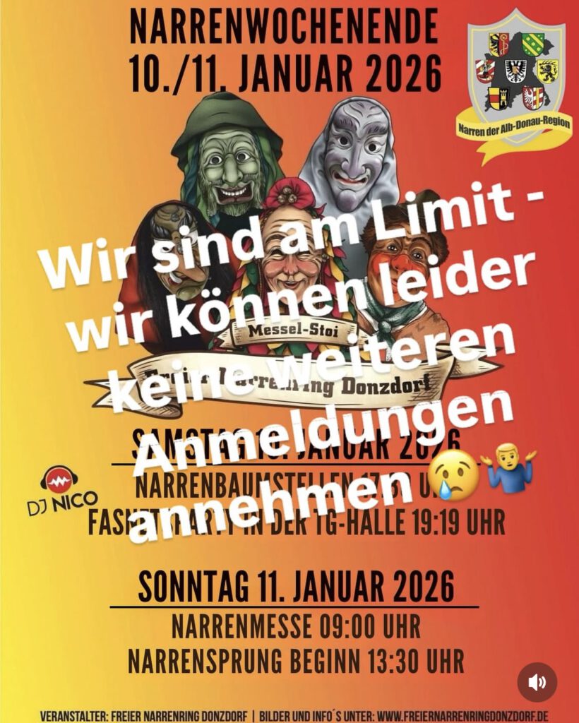die Kampagnenplanung des Freien Narrenring Donzdorf ist in vollem Gange, die meisten Auswärtsumzüge sind bereits angemeldet und auch die Planungen für unser 4. Narrenwochenende mit dem 36. Donzdorfer und gleichzeitig dem 33. Narrensprung der Narren der Alb-Donau-Region laufen auf Hochtouren!